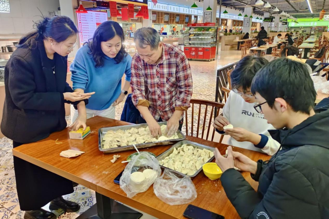 饺宴初幕,工作人员早早布置好场地、备妥食材,为这场专属于师生的温馨聚会拉开序幕。活动现场,家庭经济困难学生与老师们围坐一堂,分工协作揉面、擀皮、包饺子,热闹又温情的氛围弥漫全场。包饺子的老手们动作麻利,转眼就捏出圆润饱满的饺子;初次尝试的新手们,则在老师和学长学姐的耐心指导下慢慢摸索技巧。大家一边忙活一边畅谈,欢声笑语在场地里不断回荡。当热气腾腾的饺子出锅装盘,大家围坐在一起,共同品尝这份凝聚着汗水与心意的美味。氤氲的热气里,老师们与家庭经济困难学生们分享学习生活的点滴,促膝长谈间,真诚交换心声,凝聚成长共识。